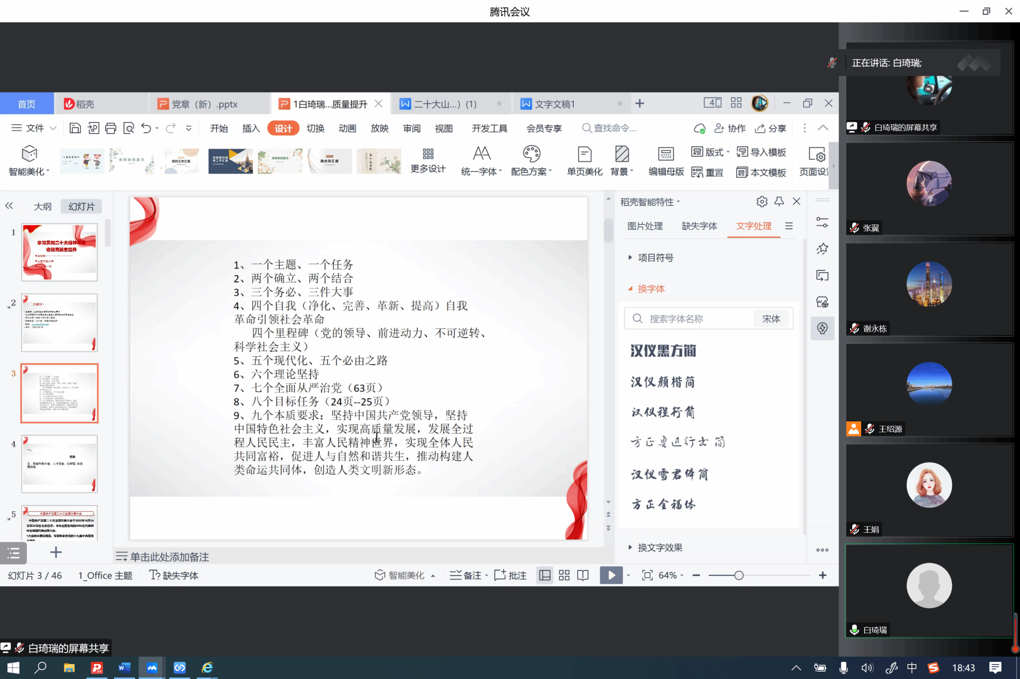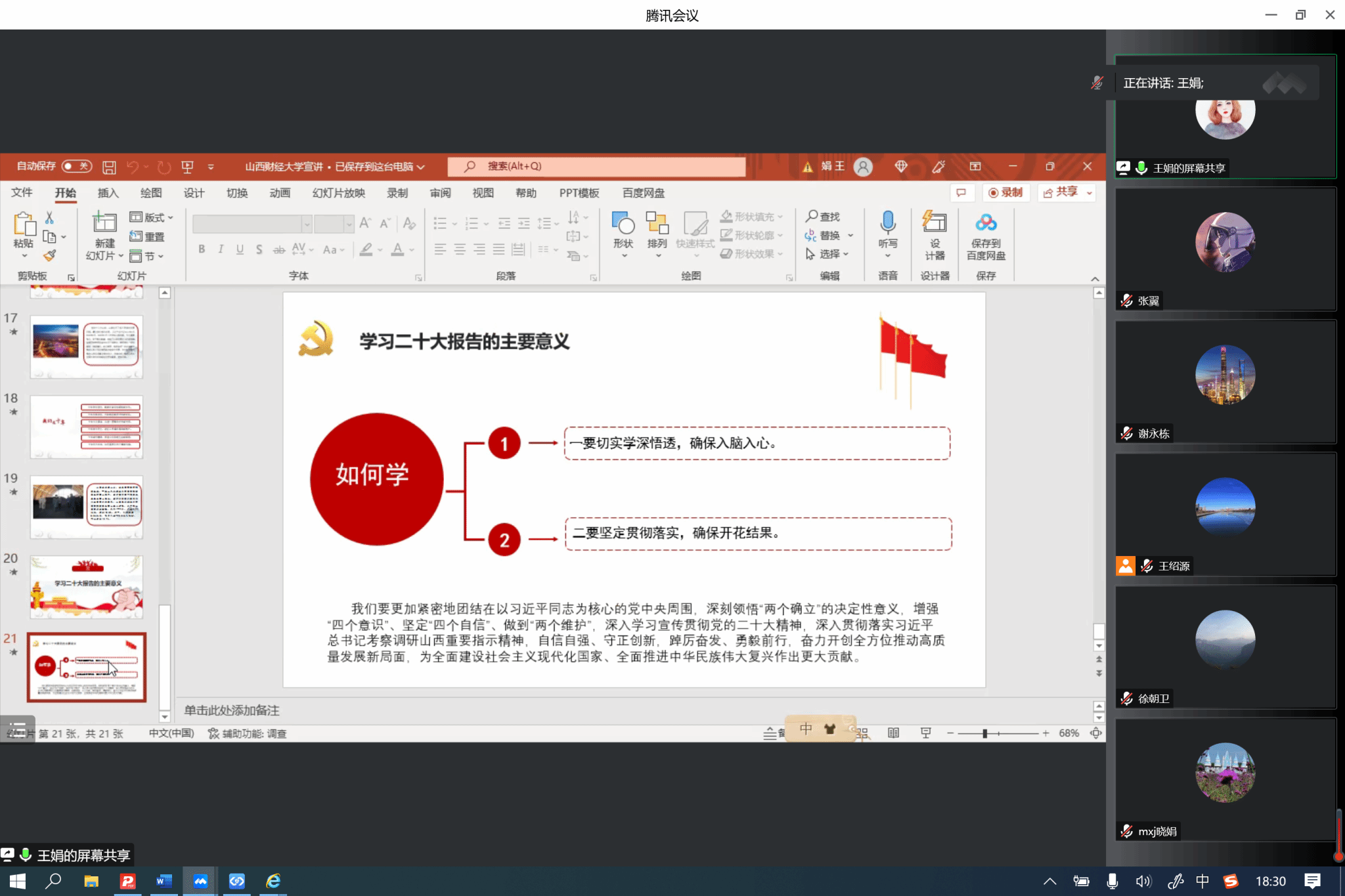 在集体备课会上,围绕学习宣传贯彻党的二十大精神这一主题主线,太阳集团tyc539王娟老师、白琦瑞老师分别就开展党的二十大精神宣讲的核心理念、内容要点、手段依循、方法依托等方面进行了导学。在此基础上,与会成员集中围绕学习阐释党的二十大精神这一主题,在宣讲内容、宣讲形式、宣讲方法等方面达成了思想共识,为接下来宣讲活动的开展奠定了坚实基础。