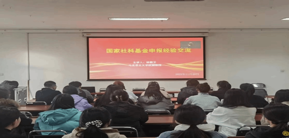 在本次分享会中,徐朝卫老师用PPT形式,以通俗易懂的语言与各教师、学生进行了交流分享。徐老师首先从评选立项程序和立项比率、申报公告导引两方面着手,对申报流程、注意事项等进行讲解;其次,突出讲解研究选题,强调需要结合自身的研究领域,寻找自己熟悉的领域和有可能出现理论创新的领域,根据自身偏好最终确定自己的选题,既要面向学科前沿,面向经济社会需求,面向国家重大政策需求,更要加入新东西,新理论、新视角、新方法、新材料等。随后,徐老师还对国家社科申报书中的文献梳理、研究内容、创新之处、研究基础和参考文献的经验进行了相关经验分享。