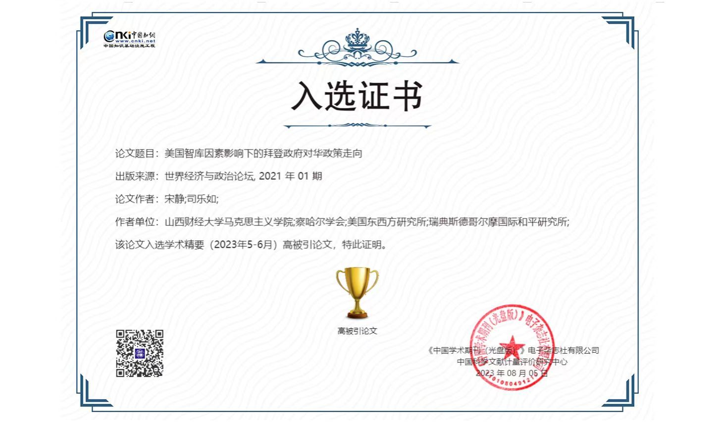 我院宋静老师于2021年1月发表在《世界经济与政治论坛》(CSSCI)的论文《美国智库因素影响下的拜登政府对华政策走向》,成功入选中国知网《学术精要数据库》2023年7-8月高影响力论文。此文系宋静老师主持的2019年国家社会科学基金后期资助项目(编号:19FGJB008)的子课题,并被《上海社会科学文摘》全文转载。转引期刊包括《当代亚太》《和平与发展》《东北亚论坛》《同济大学学报》《台海研究》《世界经济与政治论坛》《人民论坛》《国际贸易》《情报杂志》《智库理论与实践》《南亚东南亚研究》等。