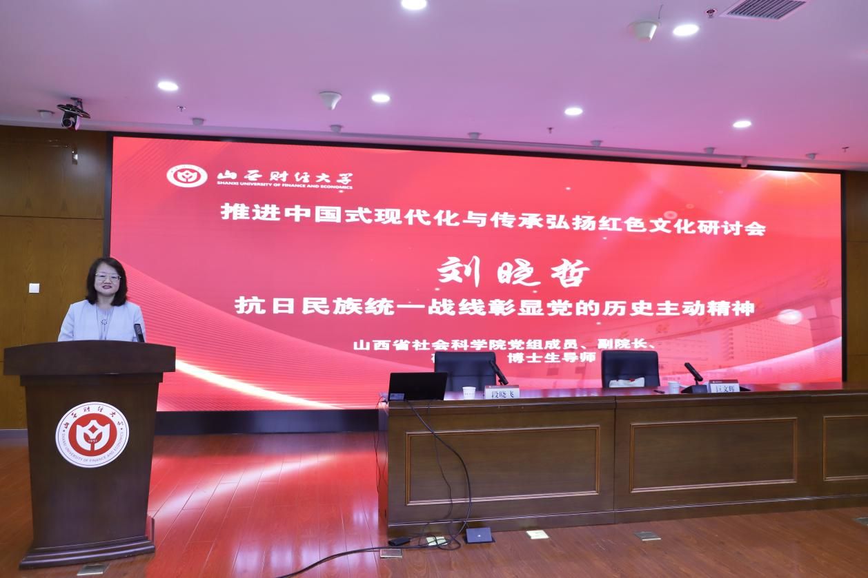 6月14日,山西省社会科学院党组成员、副院长刘晓哲研究员以“抗日民族统一战线彰显党的历史主动精神”为题,在推进中国式现代化与传承弘扬红色文化研讨会上作主旨报告。