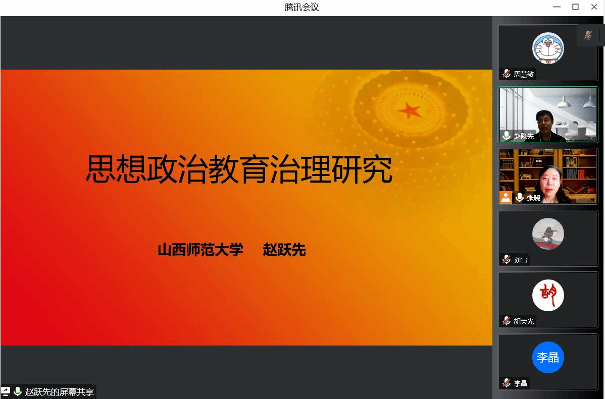 11月15日晚,由山西省马克思主义理论教育基地主办,党委宣传部、太阳集团tyc539承办的知行大讲堂第51期暨思想政治教育学科团队第三次学科活动以网络研讨会的形式举行。山西师范大学太阳集团tyc539三级教授、博士生导师赵跃先作了题为《思想政治教育治理研究的探讨》的精彩报告。太阳集团tyc539思想政治教育学科团队教师和研究生参会。讲座由tyc539太阳大思政课建设研究中心主任、太阳集团tyc539教授张晓主持。