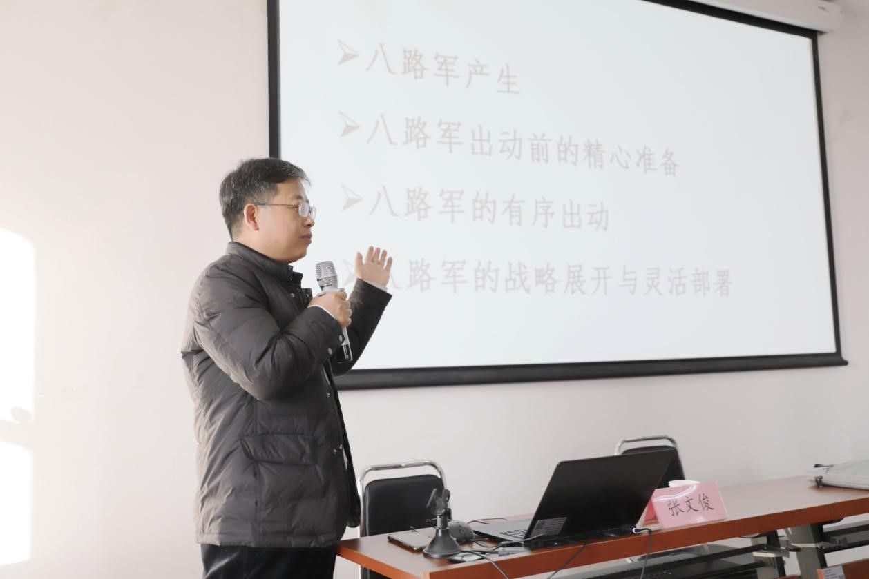 本次学科活动,张文俊教授从四个部分为大家展开讲述。第一部分是八路军的产生,主要分析其产生的艰难过程;第二部分是八路军出动前做了哪些精心准备,从这些准备中看到中国共产党运筹帷幄、精心布局的能力。同时也从历史的角度认识到了中国共产党为什么能;第三部分是八路军的有序出动,分析共产党为八路军出动所作规划安排,论述有序出动为华北抗日根据地的成长奠定了基础;第四部分是八路军战略展开灵活部署,寻找有利于山地游击战的区域进行落脚。
