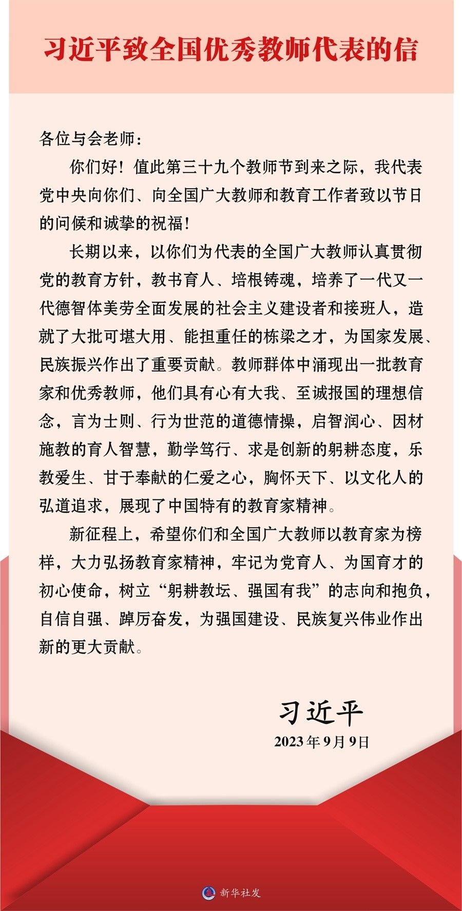 新华社北京9月9日电 全国优秀教师代表座谈会9月9日在京召开。中共中央总书记、国家主席、中央军委主席习近平致信与会教师代表,在第三十九个教师节到来之际,代表党中央,向他们和全国广大教师及教育工作者致以节日的问候和诚挚的祝福。