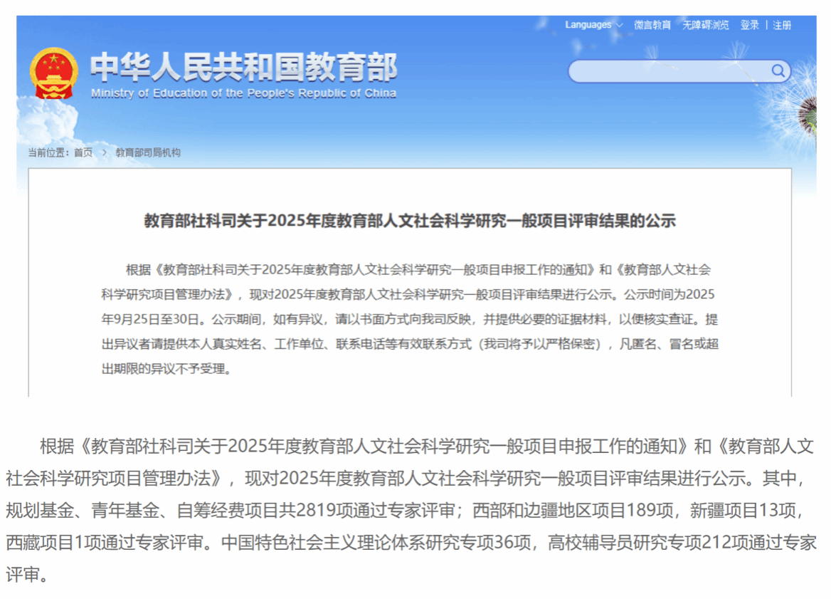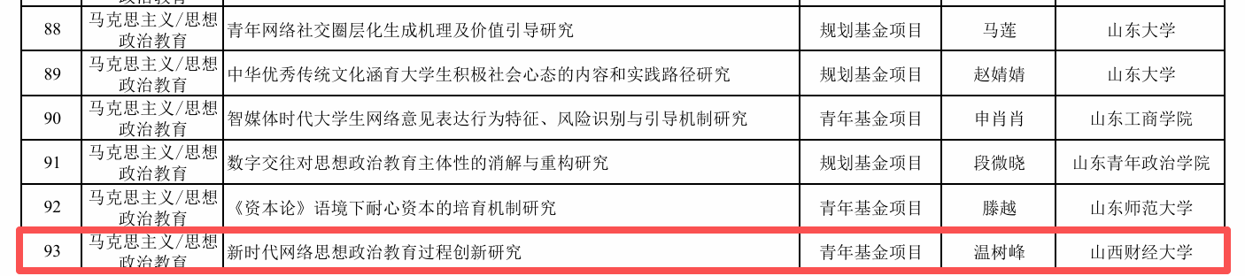 9月25日,根据《教育部社科司关于2025年教育部人文社会科学研究一般项目申报工作的通知》和《教育部人文社会科学项目管理办法》,教育部社科司对2025年度教育部人文社会科学研究一般项目评审结果进行了公示。温树峰老师申请的《新时代网络思想政治教育过程创新研究》成功获批青年基金项目立项,为学院科研工作再添佳绩。