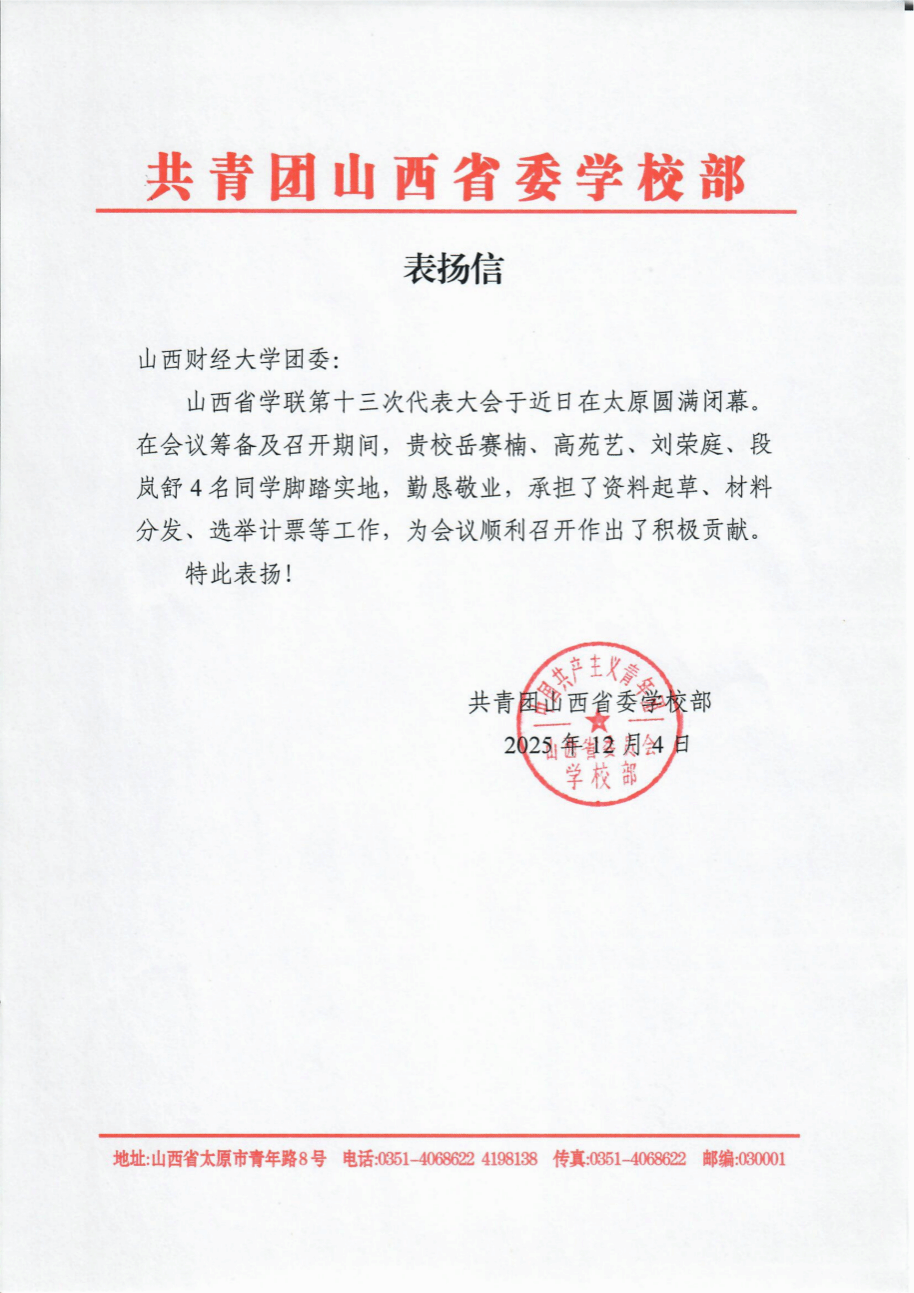 12月4日,共青团山西省委学校部向tyc539太阳团委发来表扬信,对我院岳赛楠、高苑艺、刘荣庭三名同学在山西省学生联合会第十三次代表大会筹备及召开期间的突出表现予以表扬。我院学生在大会资料起草、材料分发、选举计票等关键环节中承担重要任务,以严谨态度和扎实作风完成各项工作,获团省委充分肯定。