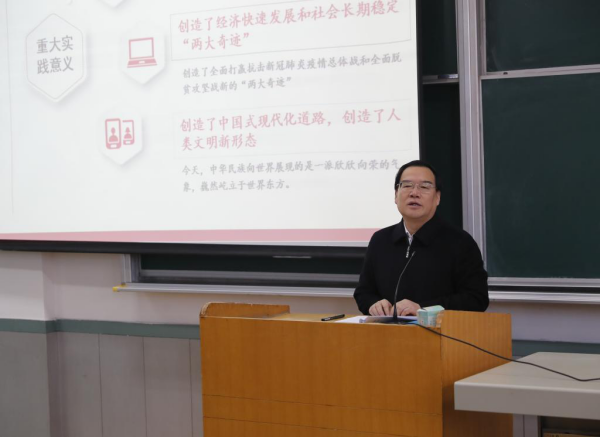 11月30日上午,党委书记丁耀武走进笃行楼101阶教,围绕学习贯彻落实党的十九届六中全会精神和省第十二次党代会精神,以“用历史观未来 以理论领征程 以担当写青春”为主题,为我校2019级法律、国民经济管理等相关专业200多名本科生讲授了一堂别开生面的思政课和党史教育课。