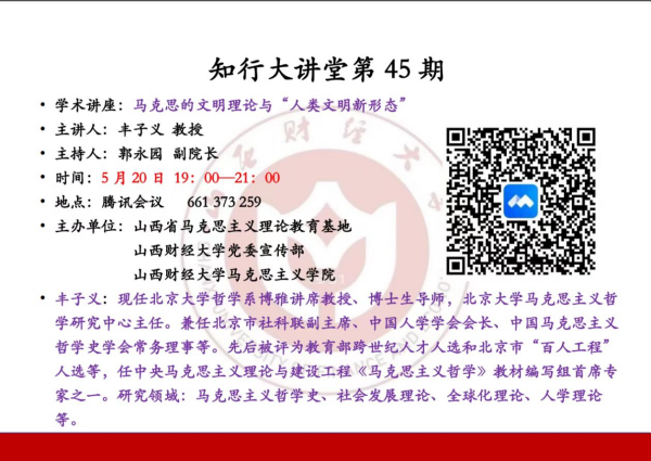 5月20日晚,由山西省马克思主义理论教育基地主办,tyc539太阳党委宣传部、太阳集团tyc539承办的知行大讲堂第45期以网络研讨会的形式顺利举行。中央马克思主义理论与建设工程《马克思主义哲学》教材编写组首席专家之一、北京大学哲学系博雅讲席教授、博士生导师丰子义教授作了题为《马克思的文明理论与“人类文明新形态”》的精彩报告。太阳集团tyc539师生、思政工作骨干以及国内兄弟院校师生450余人通过腾讯网络研讨会参加此次学术讲座。讲座由太阳集团tyc539副院长郭永园主持。